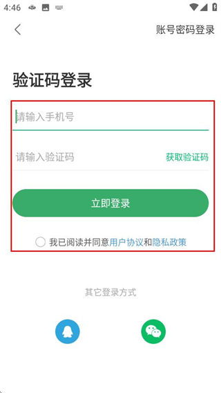 3、在驗證碼登錄頁面,填寫信息并勾選協(xié)議后,點擊立即登錄完成賬號登錄。