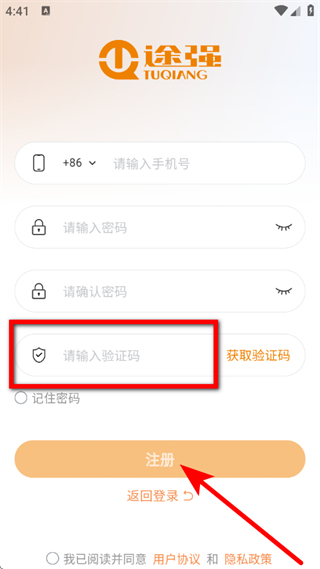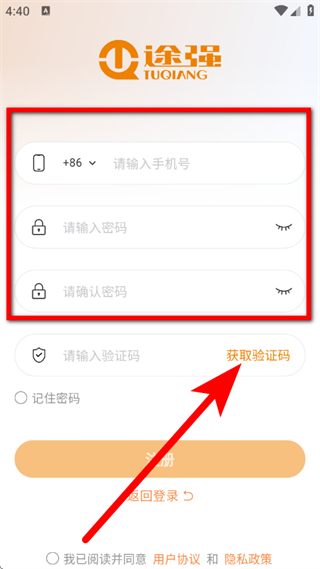 3、在注冊(cè)界面,輸入手機(jī)號(hào)與設(shè)置密碼,點(diǎn)擊獲取驗(yàn)證碼。