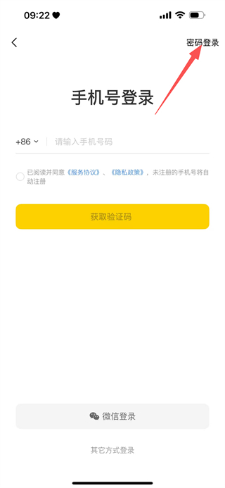 3、在手機(jī)號(hào)輸入頁面,點(diǎn)擊右上角的密碼登錄,切換到密碼登錄頁面。