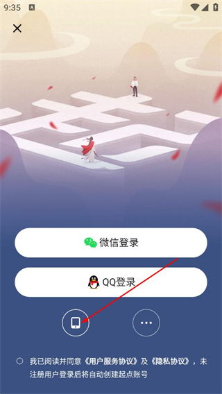 1、在起點的登錄選擇頁,點擊手機(jī)圖標(biāo),切換到手機(jī)號登錄頁面。