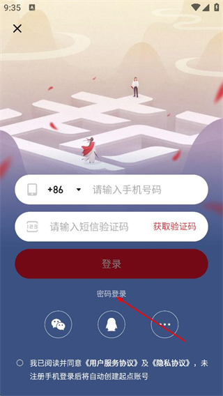 2、在手機(jī)號登錄頁面,點擊密碼登錄選項,進(jìn)入起點賬號登錄頁面。