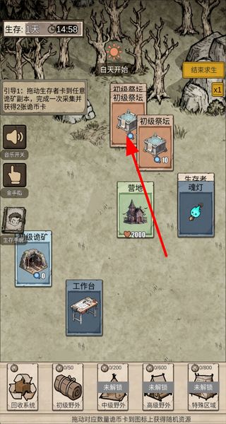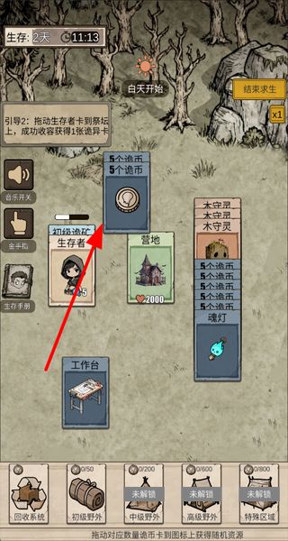 1、拖動(dòng)生存者卡到對(duì)應(yīng)建筑圖標(biāo)上,完成采集類操作,可獲得詭幣卡等資源,積累資源推進(jìn)生存冒險(xiǎn)。