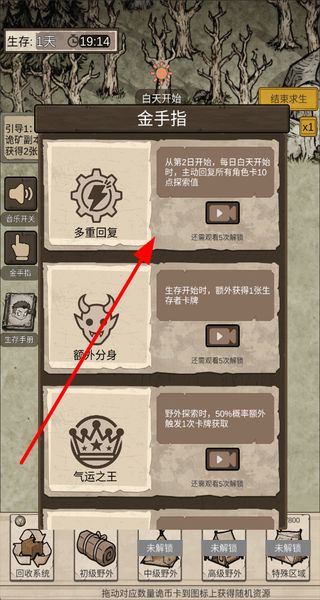 3、打開(kāi)金手指界面,解鎖對(duì)應(yīng)的功能,這些功能能提供探索值回復(fù)額外卡牌等助力,提升生存效率。
