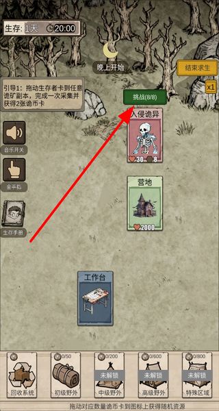 4、在晚上開(kāi)啟后,點(diǎn)擊挑戰(zhàn)按鈕應(yīng)對(duì)入侵的詭異,完成挑戰(zhàn)可推進(jìn)游戲進(jìn)度,提升生存的天數(shù)。