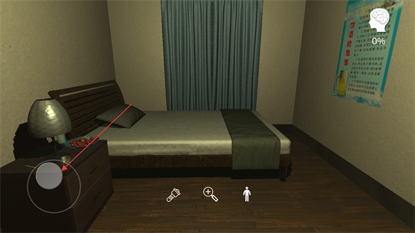 2、進(jìn)入房間場(chǎng)景后,通過(guò)左下角按鈕控制移動(dòng),利用界面里的手電筒放大等功能,留意場(chǎng)景中的細(xì)節(jié),它們可能是推進(jìn)游戲的關(guān)鍵線索。