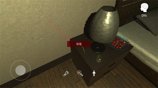 3、在該近景中,點(diǎn)擊床頭柜上的鉛筆,即可獲取此物品的信息名稱(chēng),這類(lèi)道具是解謎的關(guān)鍵,后續(xù)會(huì)用于觸發(fā)線索或完成互動(dòng)操作。
