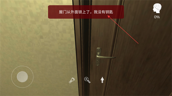 4、嘗試操作屋門(mén)時(shí)會(huì)出現(xiàn)提示屋門(mén)從外面鎖上了,我沒(méi)有鑰匙,此時(shí)需返回房間場(chǎng)景,繼續(xù)尋找能打開(kāi)門(mén)的鑰匙或相關(guān)解謎道具來(lái)推進(jìn)流程。