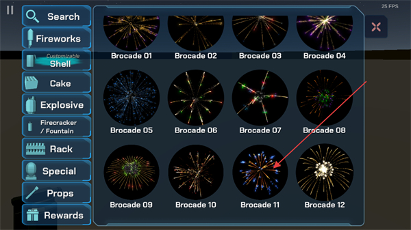 1、在煙花選擇界面,挑選想要燃放的煙花如Brocade11。