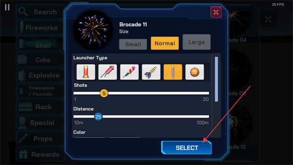 2、調(diào)整煙花參數(shù)選擇尺寸Normal、發(fā)射器類型、發(fā)射數(shù)量等,點(diǎn)擊SELECT確認(rèn)。