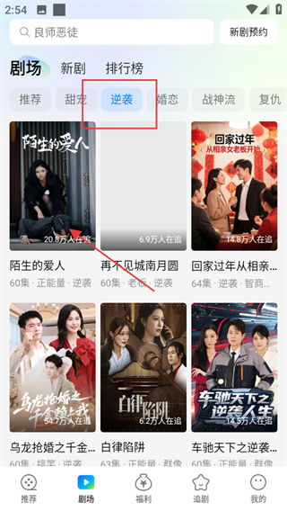 2、在劇場頁面點擊逆襲分類標(biāo)簽,點擊感興趣的短劇。