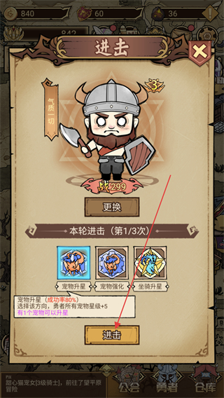 2、選擇出戰(zhàn)勇者如戰(zhàn)士,搭配寵物技能,點(diǎn)擊進(jìn)擊發(fā)起挑戰(zhàn)。