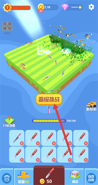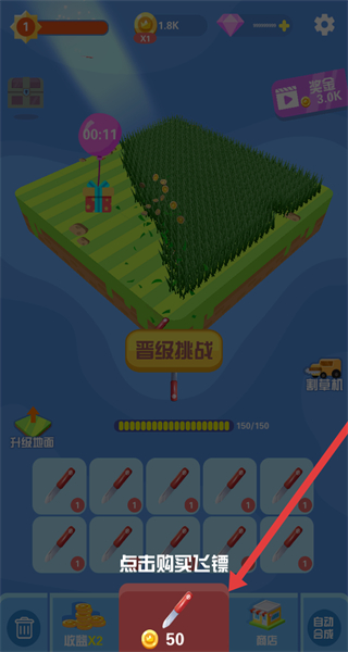 3、飛鏢會自動對草地進行收割,積累進度條后解鎖“晉級挑戰(zhàn)”,點擊即可開始挑戰(zhàn)。