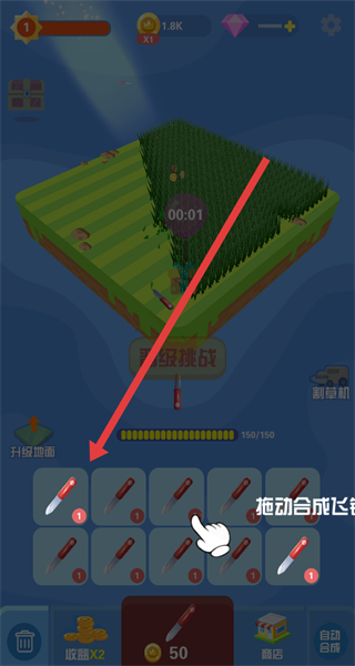 2、拖動兩個相同等級的飛鏢,合成更高等級的飛鏢,提升割草效率。