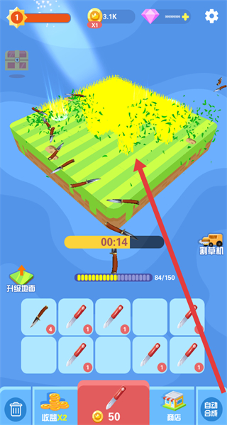 4、在限時挑戰(zhàn)界面中,滑動屏幕投擲武器,快速收割草地,獲取更多獎勵。