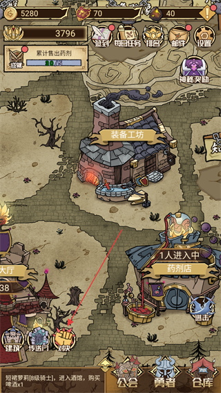1、界面有裝備工坊,藥劑店等建筑,可通過(guò)功能按鈕進(jìn)入對(duì)應(yīng)模塊,推進(jìn)游戲進(jìn)程。