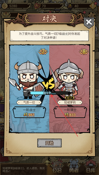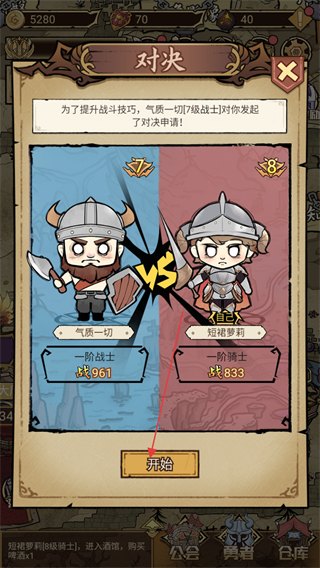 2、進(jìn)入對(duì)決界面,查看雙方勇者信息,點(diǎn)擊開(kāi)始按鈕,開(kāi)啟對(duì)決挑戰(zhàn)。