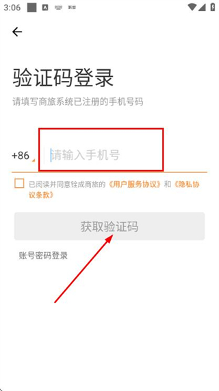 2、在登錄頁面填寫手機號,勾選協(xié)議后,點擊獲取驗證碼。
