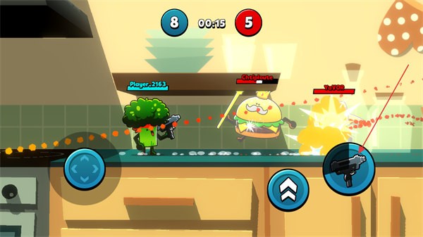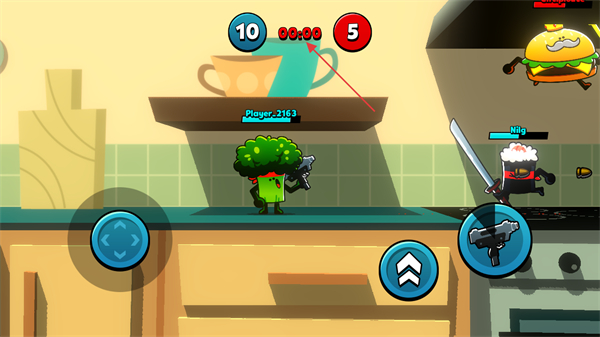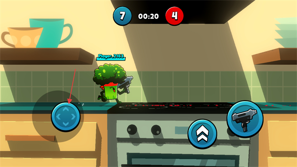 1、在該廚房對(duì)戰(zhàn)場(chǎng)景中,通過左側(cè)方向鍵操控角色移動(dòng),借助跳躍鍵調(diào)整角色位置,為后續(xù)與敵方單位的對(duì)戰(zhàn)做準(zhǔn)備。