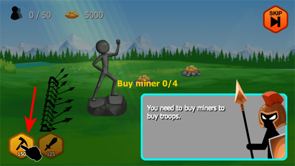 1、在游戲初始界面,點(diǎn)擊礦工類道具可招募礦工單位,礦工是獲取資源如金幣的核心,解鎖以支撐后續(xù)的軍隊(duì)招募。