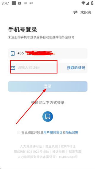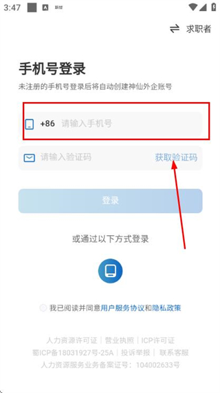 2、在登錄頁(yè)面填寫(xiě)手機(jī)號(hào),勾選協(xié)議后,點(diǎn)擊獲取驗(yàn)證碼。