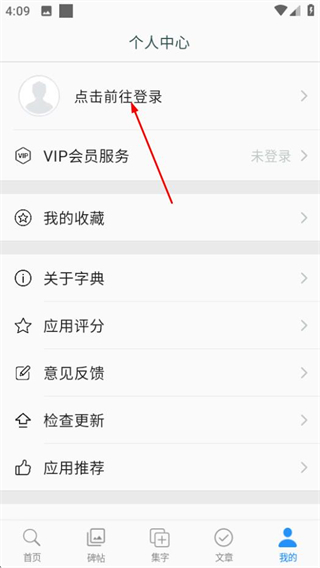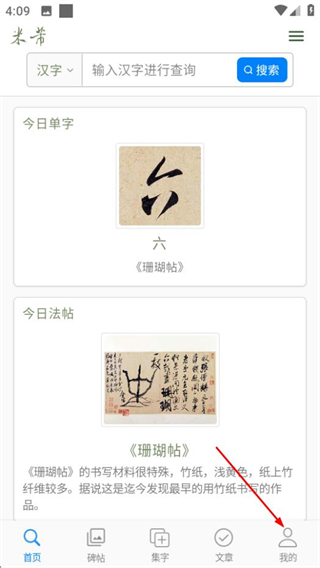 1、在米芾書法字典首頁,點擊底部的我的選項,進入個人中心頁面。