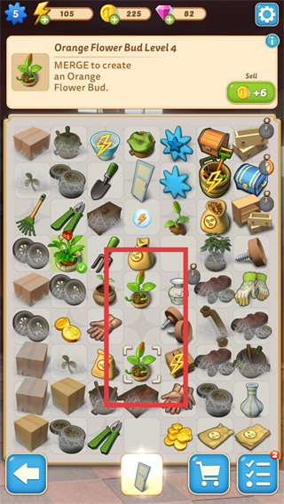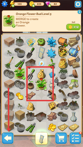 3、合并之后,直至合成任務(wù)目標(biāo)的花苗,即可點(diǎn)擊下方箭頭。