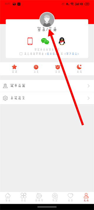 2、在個(gè)人頁(yè)面,點(diǎn)擊登錄注冊(cè),進(jìn)入登錄界面。