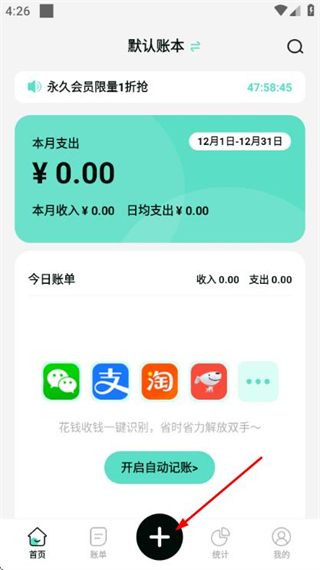 1、在首頁(yè)點(diǎn)擊底部的加號(hào)按鈕,進(jìn)入支出分類選擇頁(yè)面。