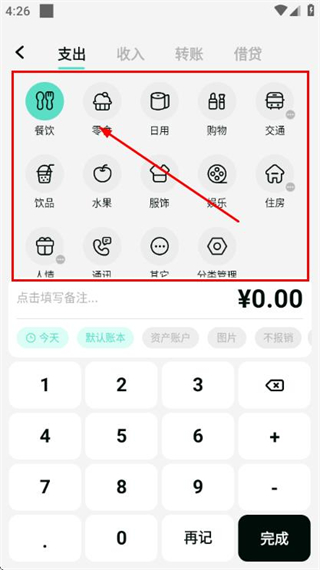 2、在支出分類選擇頁(yè)面點(diǎn)擊目標(biāo)分類,進(jìn)入記賬信息填寫(xiě)界面。