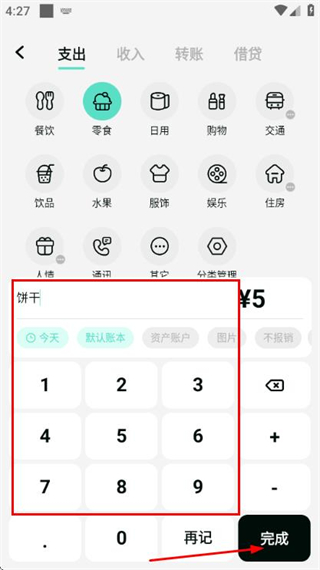 3、在記賬信息填寫(xiě)界面輸入備注和金額后,點(diǎn)擊完成按鈕,完成本次記賬操作。
