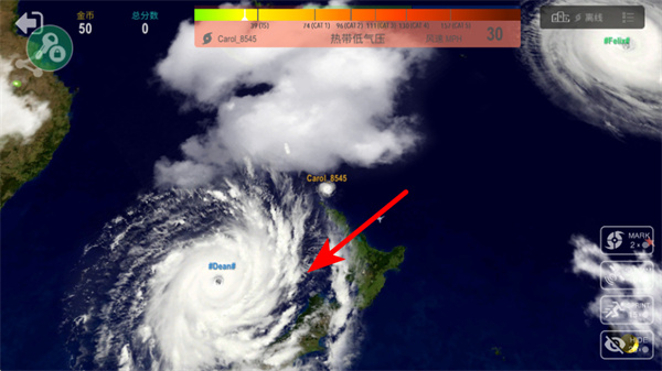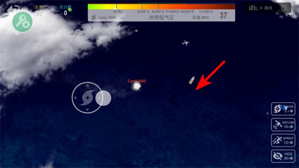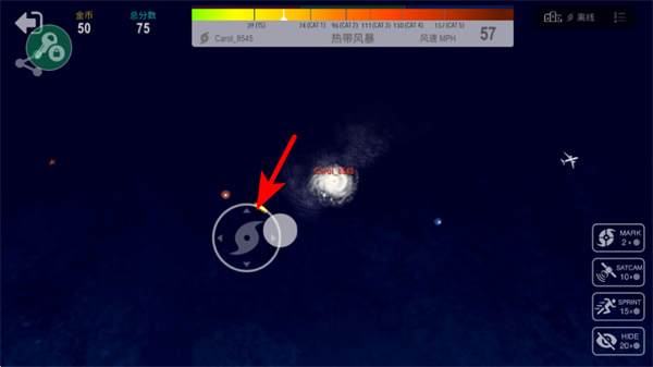 2、進(jìn)入場(chǎng)景后,可觀察颶風(fēng)的初始狀態(tài)如位置強(qiáng)度,通過操控區(qū)域調(diào)整颶風(fēng)的移動(dòng)方向,向目標(biāo)區(qū)域如陸地靠近,推進(jìn)玩法進(jìn)度。