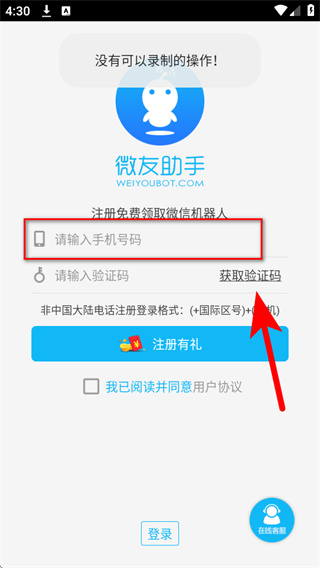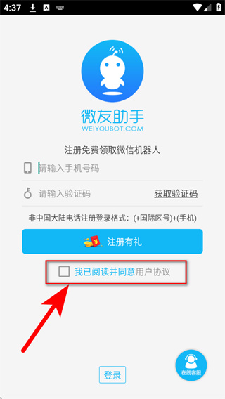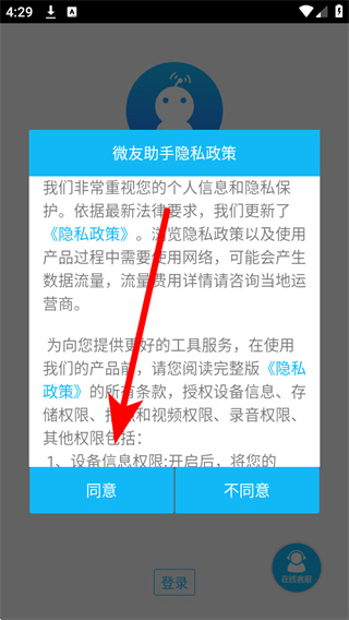 1、打開微友助手,在微友助手隱私政策中,閱讀相關內(nèi)容后點擊同意,進入注冊頁面。