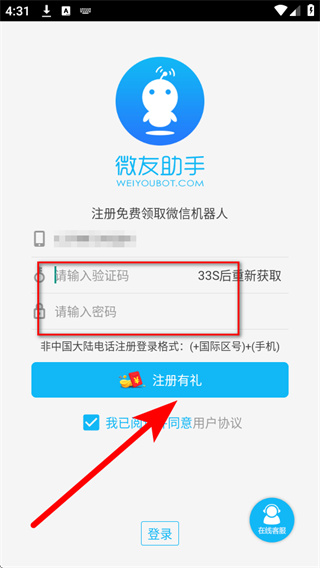 4、將收到的短信驗證碼填輸入框,同時設置賬號密碼,確認信息無誤后點擊注冊有禮,完成賬號注冊。