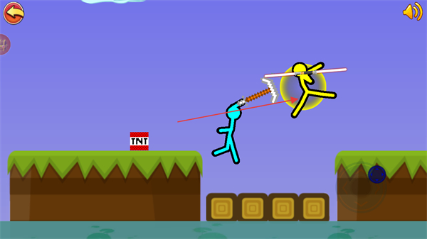 2、利用武器攻擊對手,可借助場景元素如TNT輔助壓制,消耗對方血量。