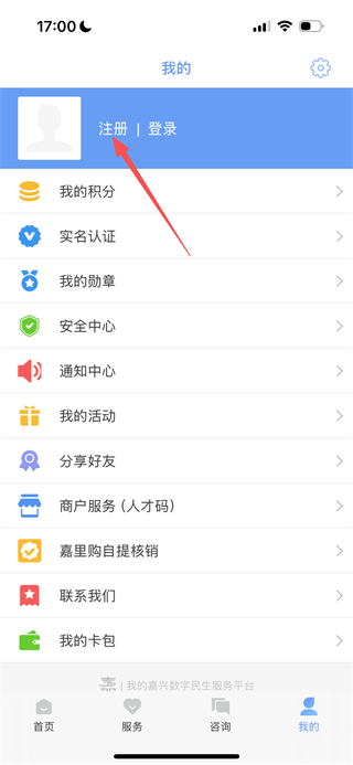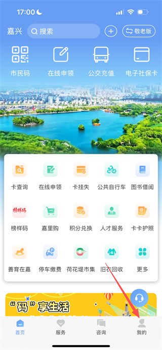 1、在我的嘉興首頁(yè),點(diǎn)擊底部的我的選項(xiàng),進(jìn)入個(gè)人中心頁(yè)面。