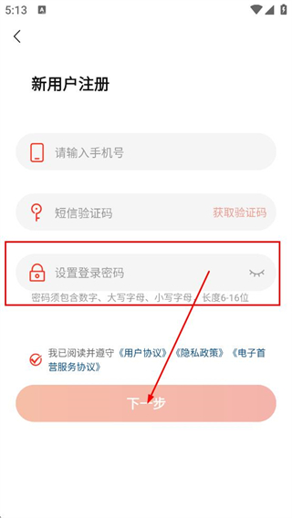 3、在注冊(cè)頁(yè)面,填寫(xiě)登錄密碼,點(diǎn)擊下一步,完成新用戶注冊(cè)。