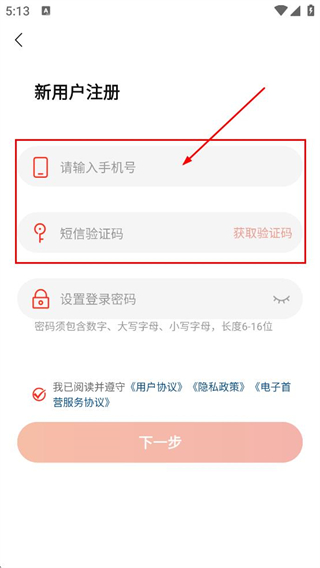 2、在新用戶注冊(cè)頁(yè)面,填寫(xiě)手機(jī)號(hào)、收到的短信驗(yàn)證碼。