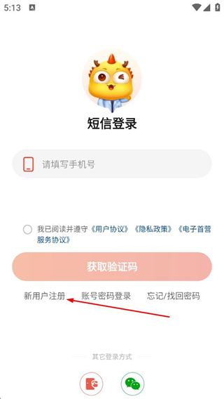 1、在短信登錄頁(yè)面,點(diǎn)擊新用戶注冊(cè)選項(xiàng),進(jìn)入注冊(cè)頁(yè)面。