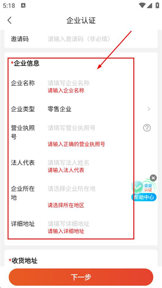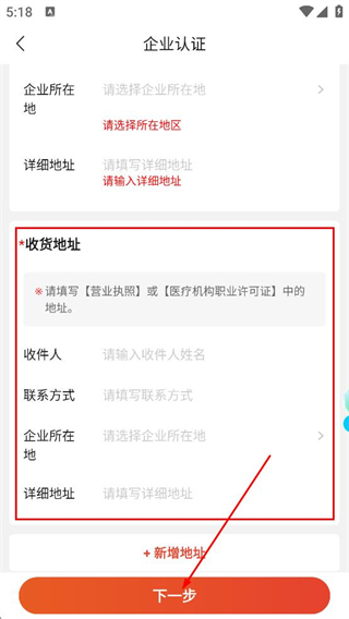 3、在收貨地址區(qū)域,填寫收件人-聯(lián)系方式-企業(yè)所在地-詳細(xì)地址,點(diǎn)擊下一步,即可完成認(rèn)證流程。