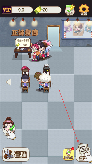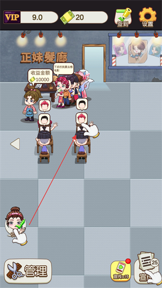 1、在正妹髮廊內(nèi),點(diǎn)擊顧客安排入座,完成服務(wù)后獲取收益金額,積累資源。