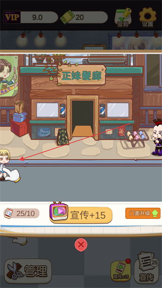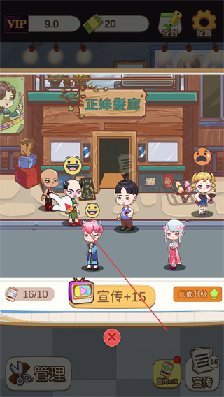 3、點(diǎn)擊宣傳相關(guān)選項(xiàng),獲得宣傳+15效果,增加到店顧客數(shù)量。