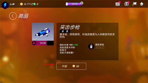 1、在商品界面,消耗資源點(diǎn)擊升級(jí)按鈕,提升突擊步槍屬性,增強(qiáng)武器戰(zhàn)力。