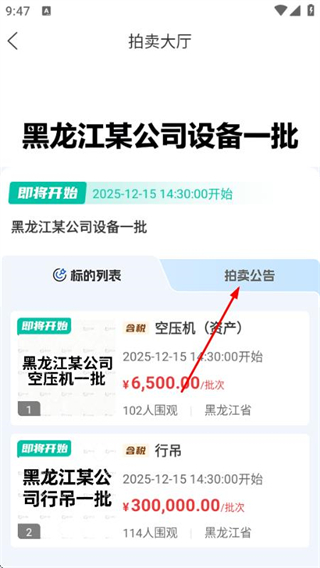 3、在拍賣大廳頁面點(diǎn)擊拍賣公告選項(xiàng),進(jìn)入競(jìng)買公告頁面。