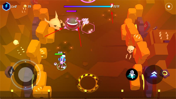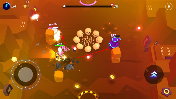 1、在戰(zhàn)斗場景中,操控角色移動并攻擊集群敵人,利用范圍輸出快速清理目標,推進關卡進度。