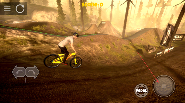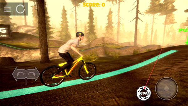 2、進(jìn)入關(guān)卡后,點(diǎn)擊界面中的PEDAL按鈕踩動(dòng)自行車齒輪開始騎行,保持在軌跡上推進(jìn)當(dāng)前關(guān)卡進(jìn)程。