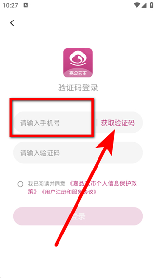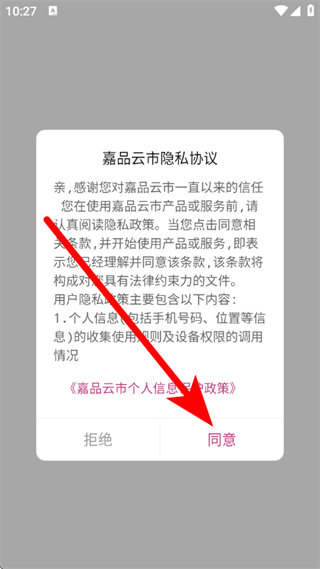 1、打開嘉品云市,在彈出的隱私協(xié)議彈窗中,點擊同意。