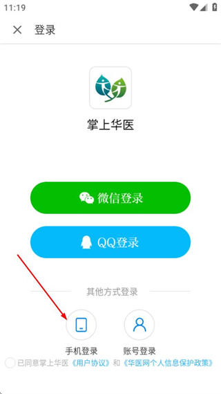 3、在登錄頁面,點(diǎn)擊手機(jī)登錄選項(xiàng),進(jìn)入驗(yàn)證碼登錄注冊(cè)頁面。