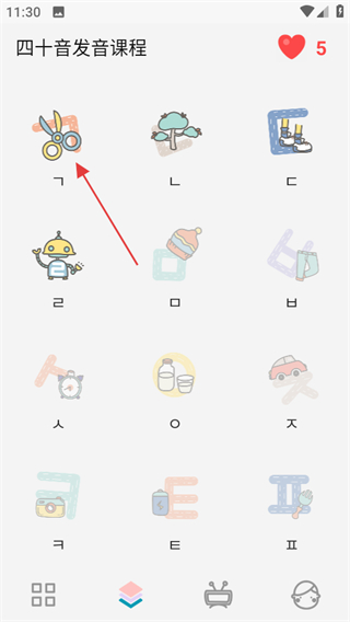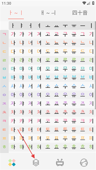 1、在韓語(yǔ)字母發(fā)音表首頁(yè),點(diǎn)擊底部的課程圖標(biāo),進(jìn)入四十音發(fā)音課程頁(yè)面。