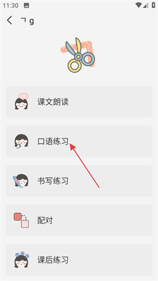 3、在字母練習(xí)頁(yè)面,點(diǎn)擊口語(yǔ)練習(xí)選項(xiàng),進(jìn)入口語(yǔ)練習(xí)界面。