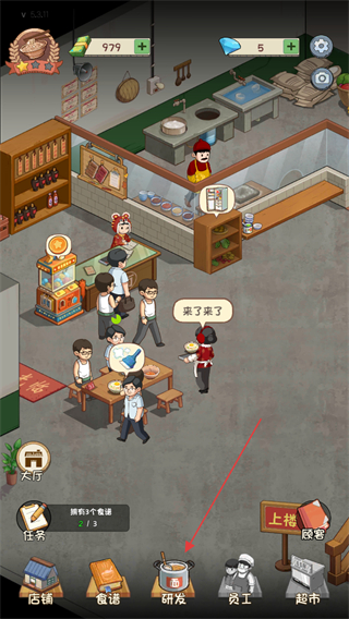 1、在面館主界面點擊底部的研發(fā)按鈕,進入新品研發(fā)頁面以此更新面館菜品豐富可提供的餐食種類。